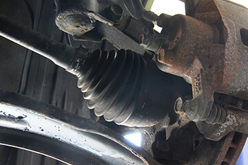 タイヤの内側にジャバラの形状の物があり、このブーツが破けると、中のグリスが飛んでしまい、ハンドルを切って曲がるとき異音がします。